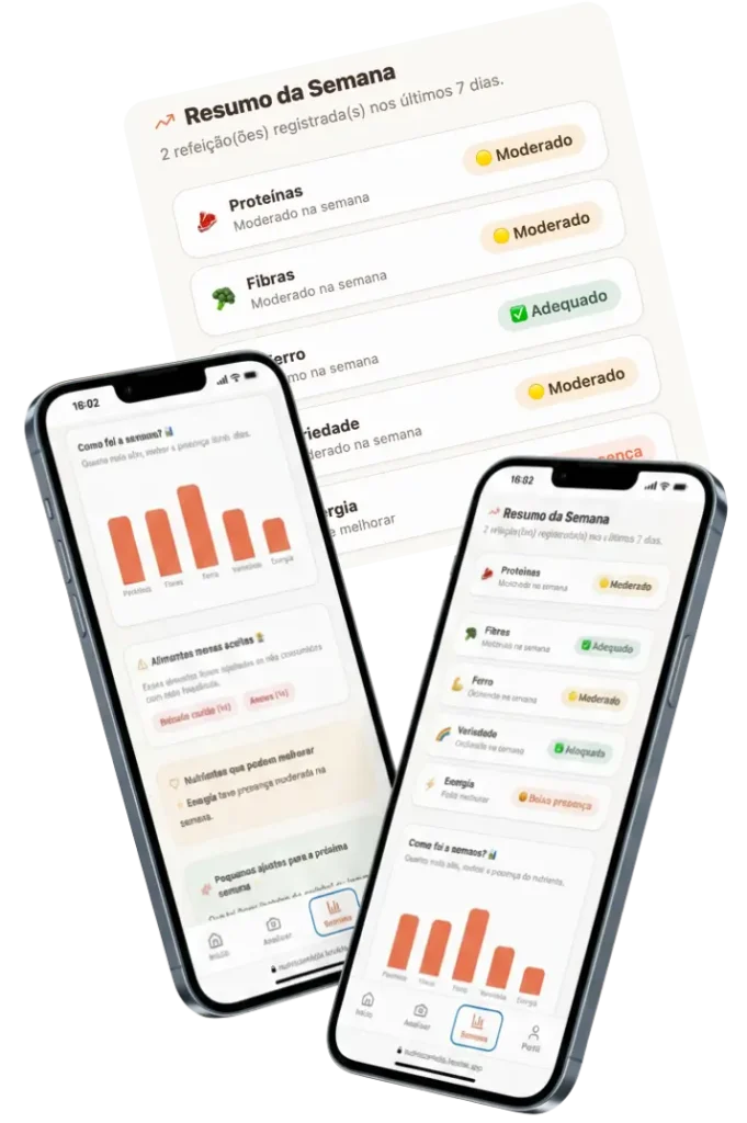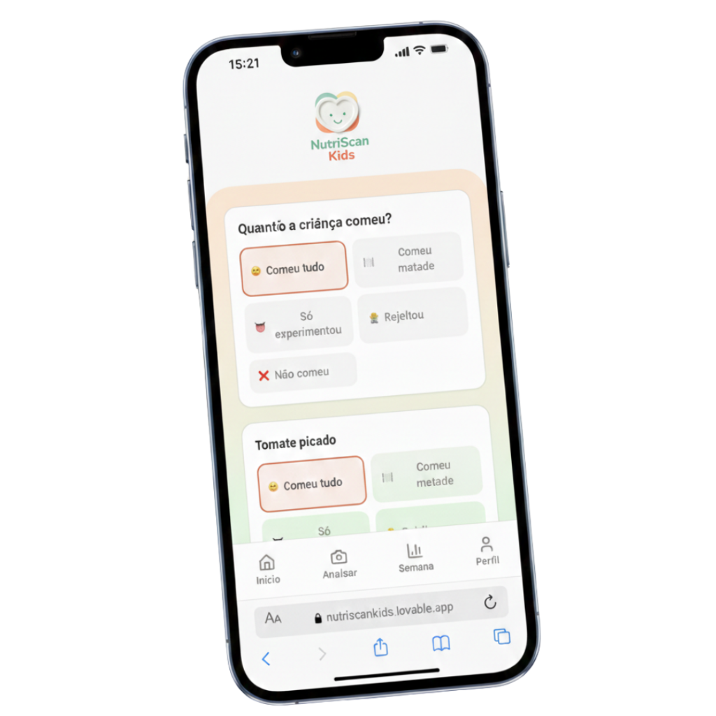 A IA identifica automaticamente os alimentos, você informa o que ele realmente comeu — e em poucos minutos recebe uma visão clara se a alimentação está entregando proteínas, fibras, ferro, energia e variedade suficientes para sustentar crescimento, aprendizagem e disposição, mesmo quando ele come pouco ou de forma repetitiva.