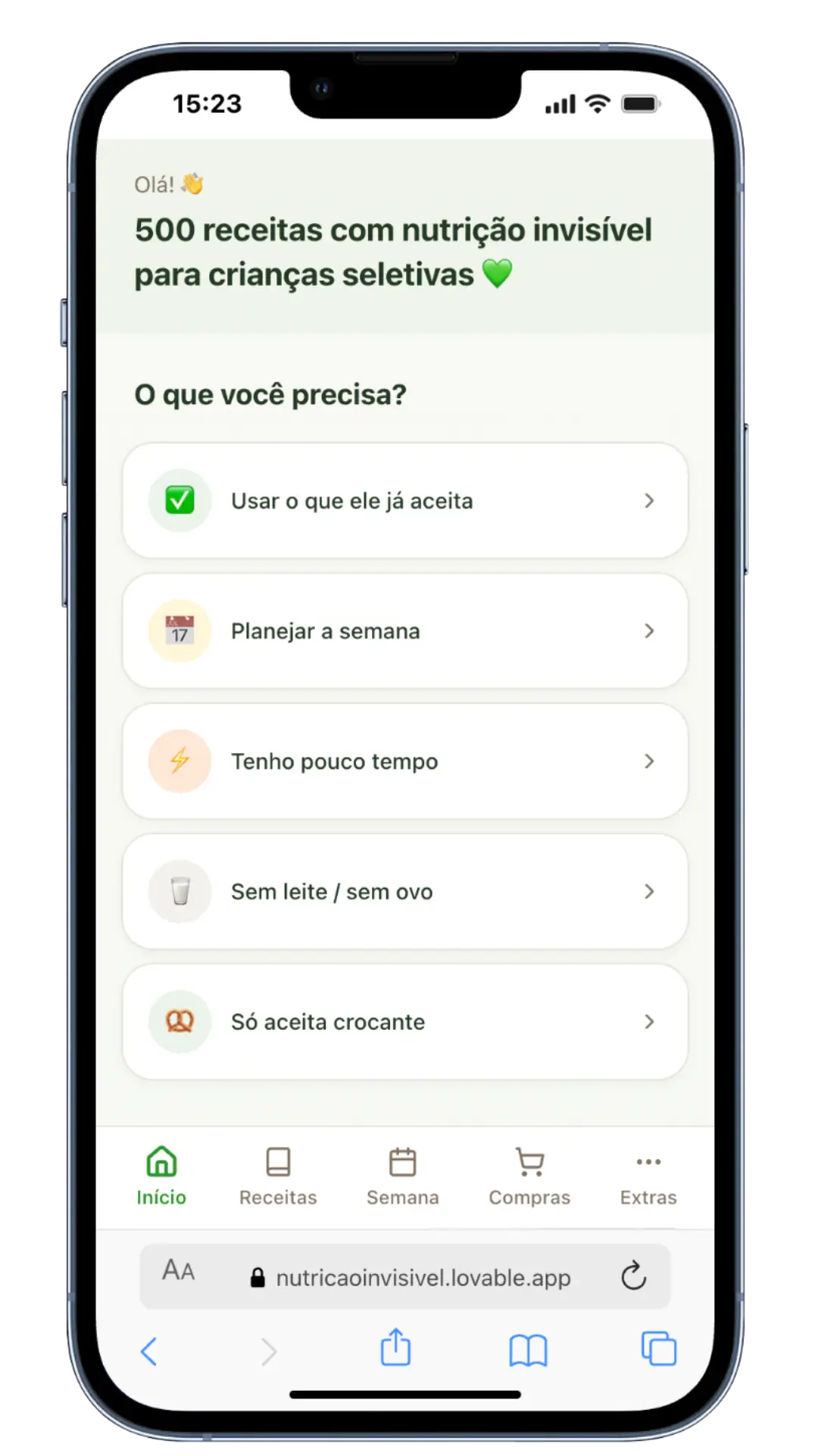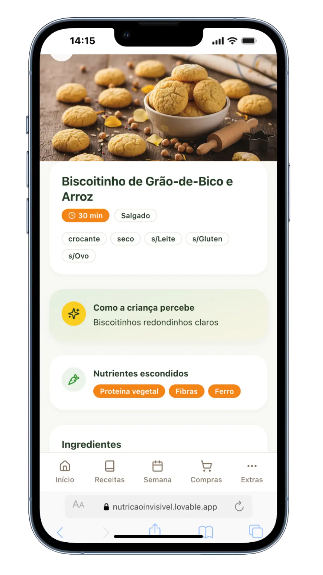 Encontre receitas em segundos: “Usar o que ele já aceita” “Textura crocante ou seca” “Sem leite / sem ovo” “Pouco tempo” Menos cansaço mental, mais decisão rápida.